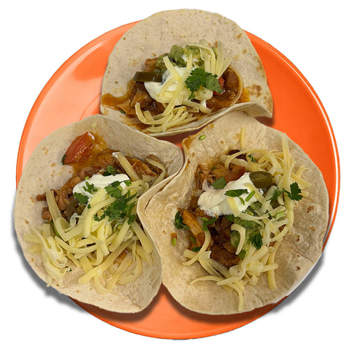 Pulled pork, cheese, tomato salsa, guacamole and sour cream in 3 soft taco shells.